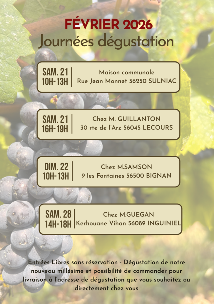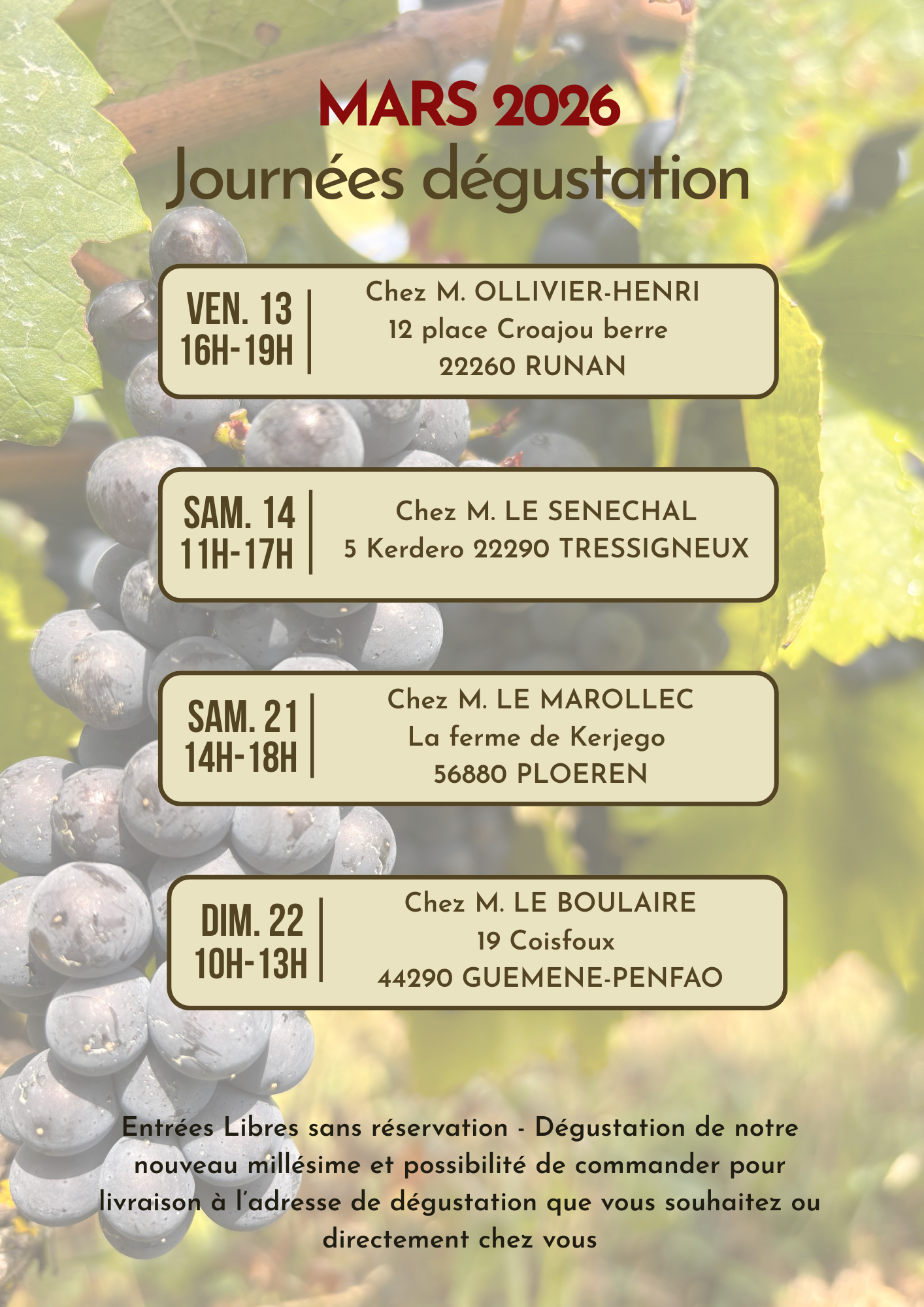 Dates de dégustation en Bretagne (56 & 22) Févier-Mars 2026